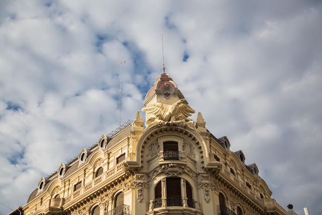 Llama la atención a primera vista su chaflán en el que destaca un águila emprendiendo el vuelo sobre dos angelotes y que es todo un icono de la ciudad.