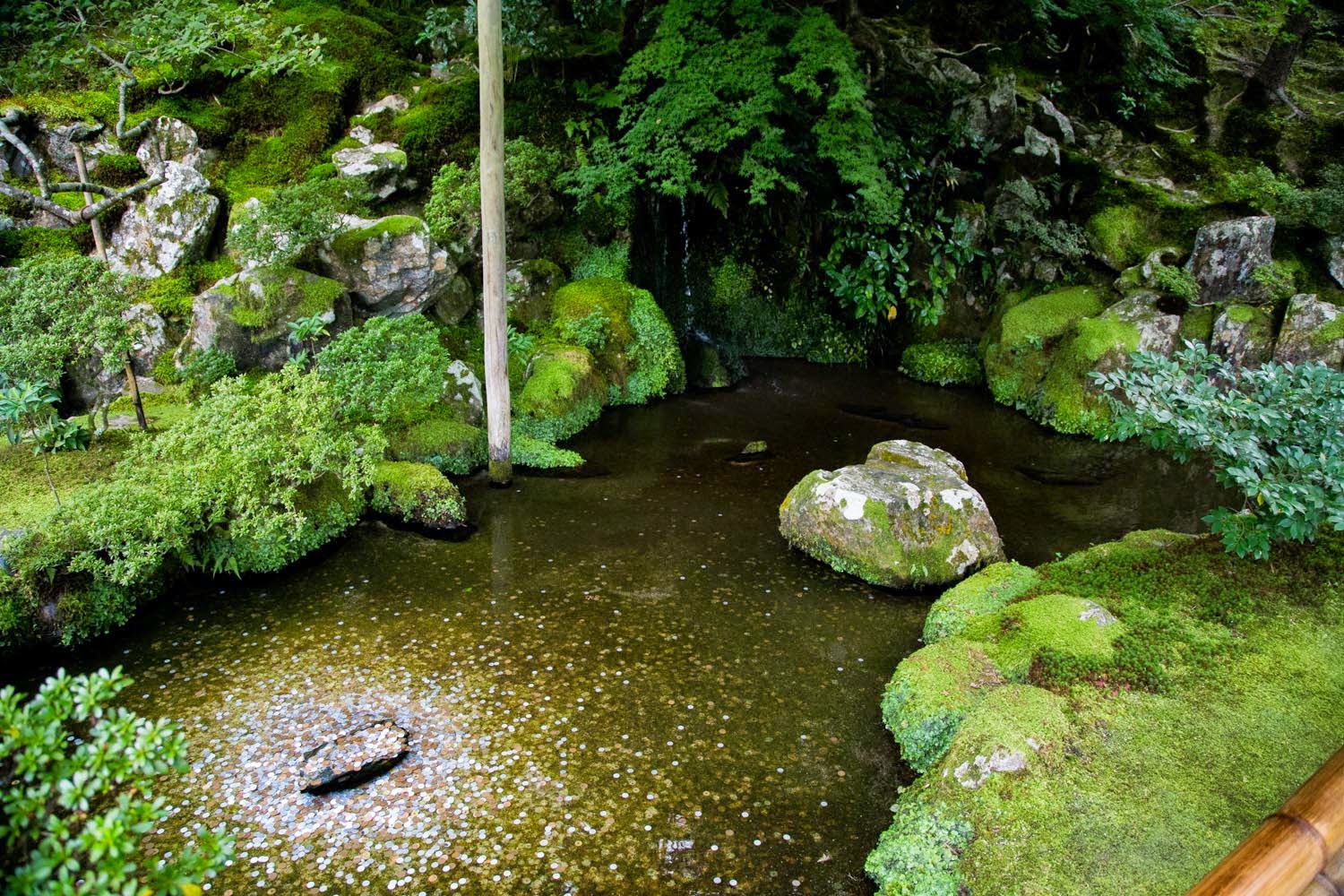 En la actualidad este complejo contiene el citado Pabellón Plateado y otros seis edificios auxiliares, así como un jardín de arena y piedras, característico de la doctrina Zen, y un precioso jardín de musgo. Durante toda la visita se puede disfrutar de la frondosa y característica vegetación típica de Japón.